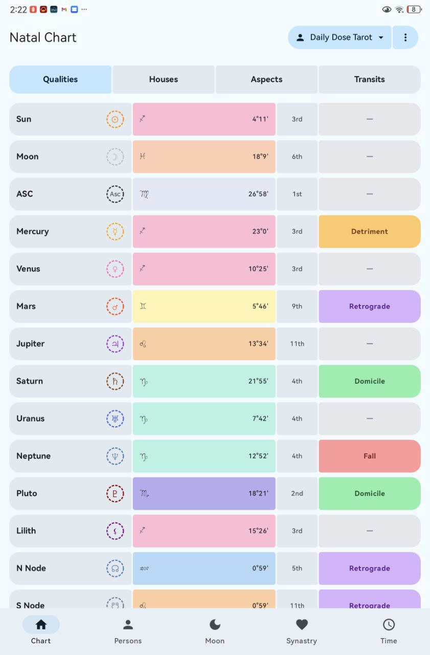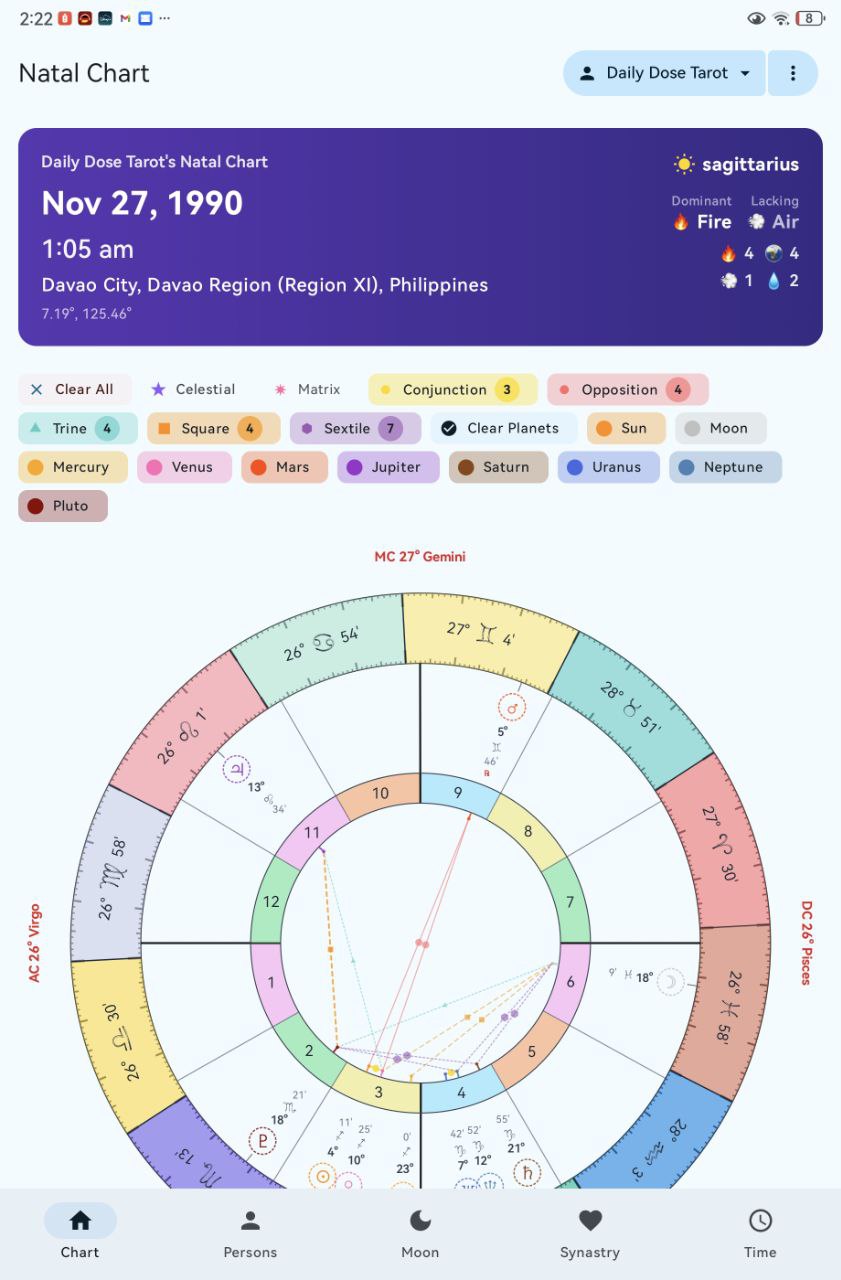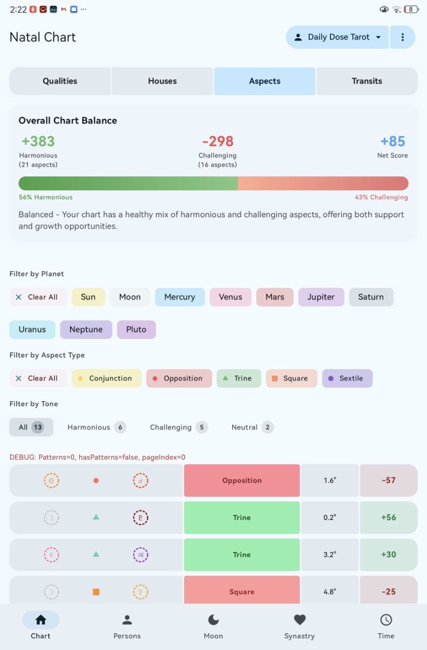 A powerful Android astrology app for your tablet. Get accurate birth charts with 15 celestial bodies, check relationship compatibility, explore Matrix of Destiny readings, and track moon phases. Built with Jetpack Compose for smooth, beautiful charts that load instantly. Perfect for astrology enthusiasts who want professional insights on the go.