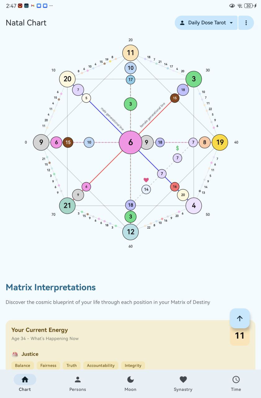 Explore your life path through the Matrix of Destiny - a mystical system using tarot cards mapped to your birth date. Tap any number on the colorful chart to discover what it means for your current life stage, relationships, career, and spiritual journey.
